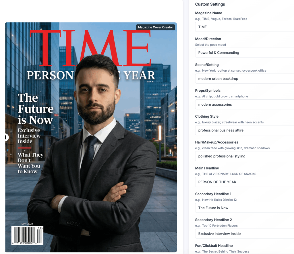 Today, you can add your photo to a magazine cover, customize every headline, control the style, and generate a professional-looking result in minutes. No Photoshop. No photography studio. No prompt-writing headaches.